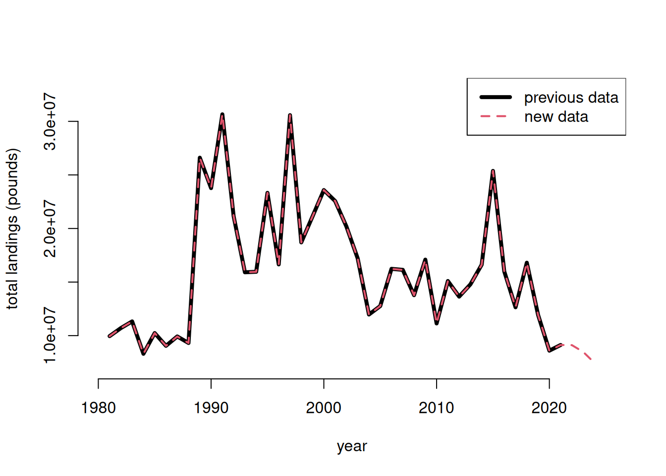 matplot(rownames(fin), fin/10^6, lty =c(rep(2, 4), rep(1, 4)), col =rep(1:4, 2), type ="l", lwd =2, xlab ="year", ylab ="total landings (millions of pounds)")legend("topright", colnames(fin), lty =c(rep(2, 4), rep(1, 4)), col =rep(1:4, 2), lwd =2, ncol =2, bty ="n")