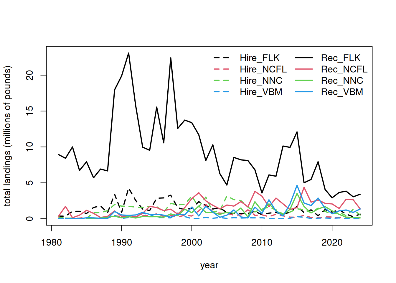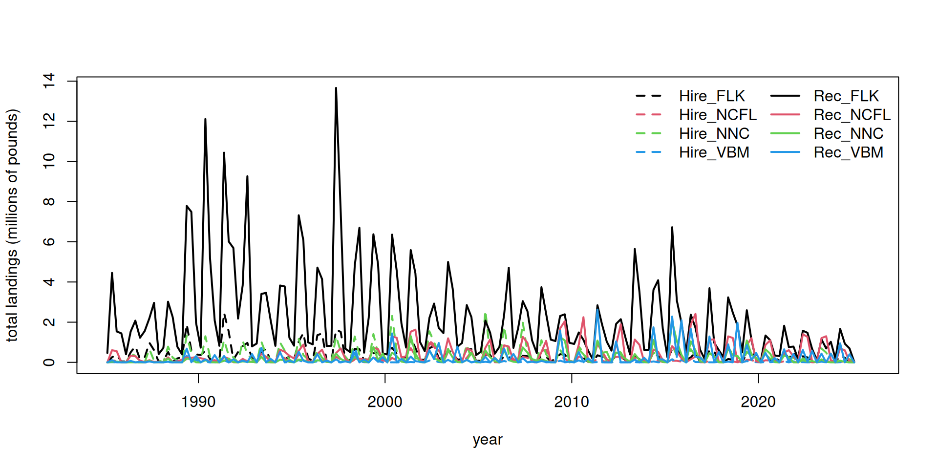 Here we will partition recreational landings data from NOAA Fisheries’ Marine Recreational Information Program (MRIP), a standardized, peer-reviewed suite of recreational fishing surveys used to produce catch and effort estimates for quota monitoring and stock assessment in the United States. MRIP is a standardized survey suite that employs a complex statistical sampling design stratified across time, regions of the coast, and different fishing modes, which allows the intercept data to be scaled up by effort estimates to calculate total catches.