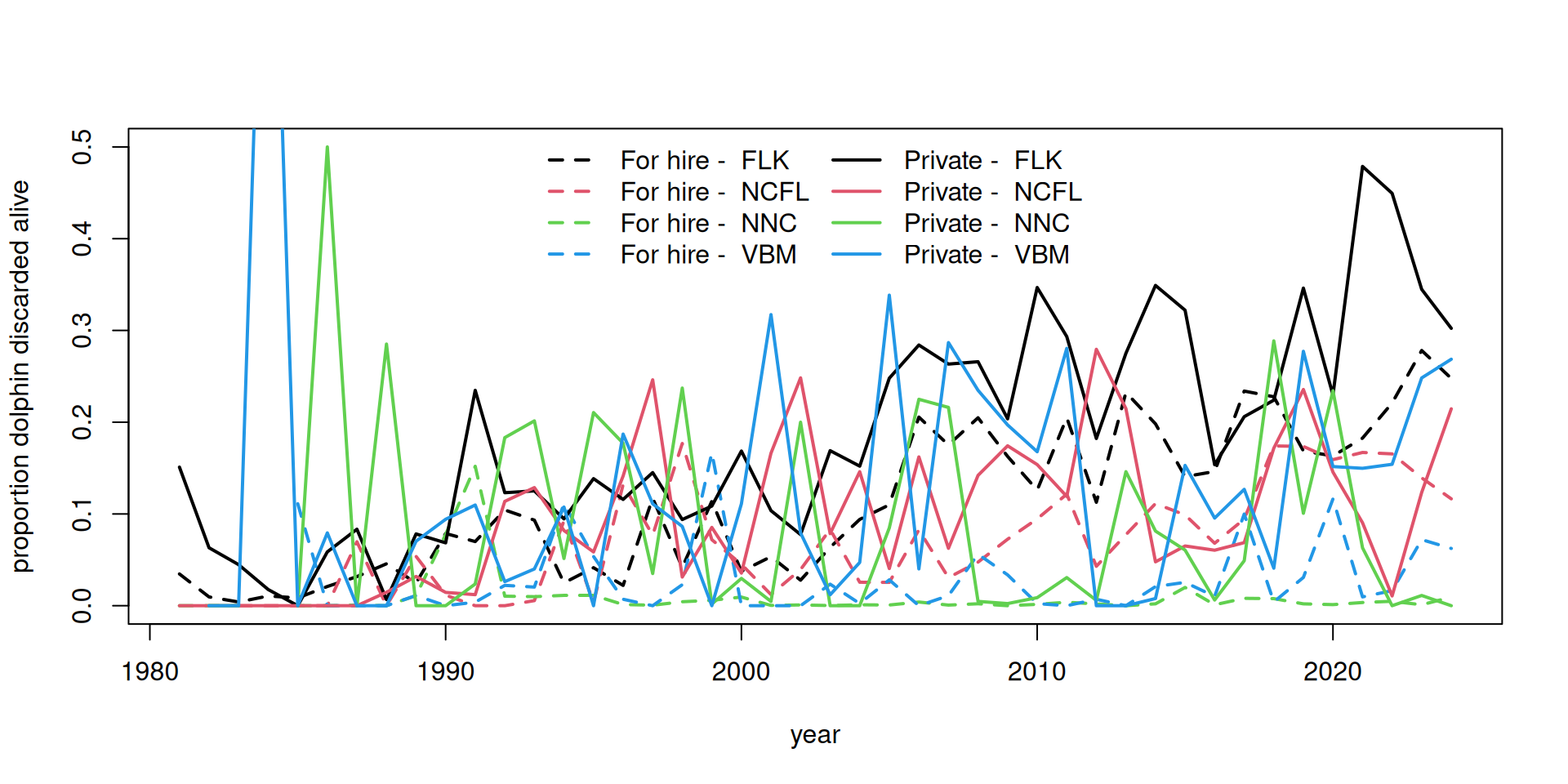 Discard estimates (known as B2 estimates) are provided in numbers by the MRIP survey but are not available in the Southeast Region Headboat Survey. We can look at the overall numbers of dolphinfish caught versus reported released from the MRIP survey to get an understanding of the extent of discarding.
