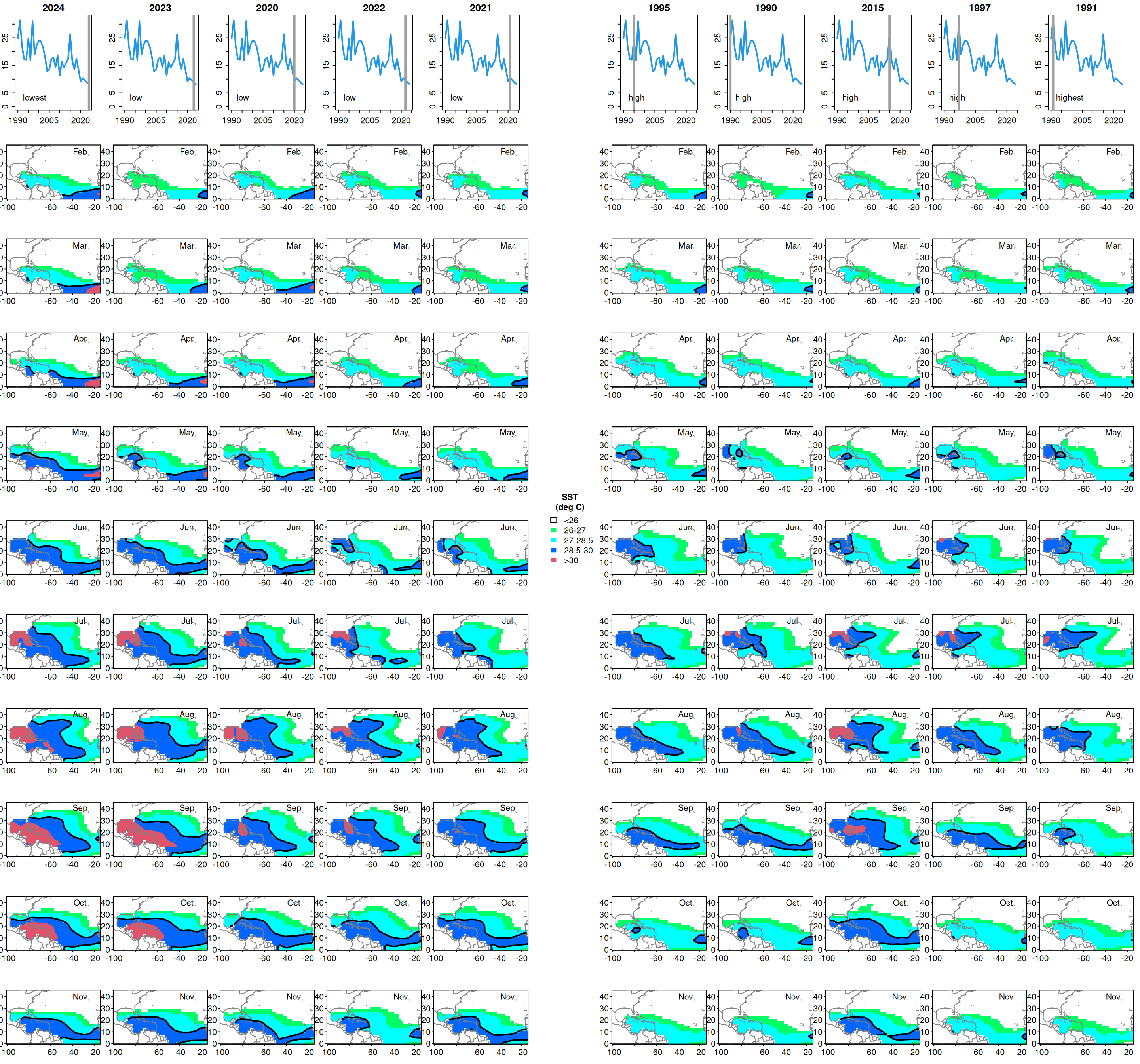 title = "SST\n(deg C)", title.font = 2)