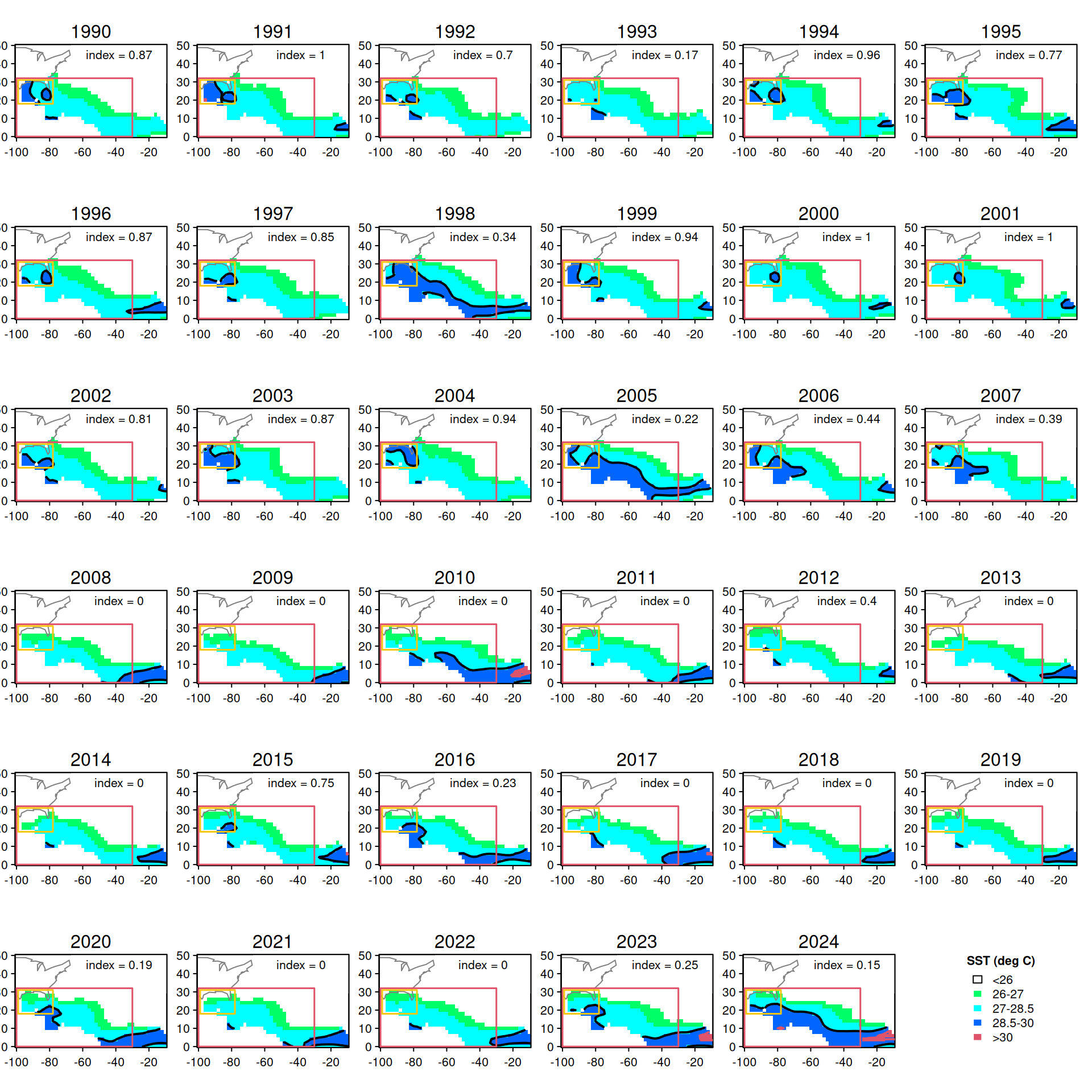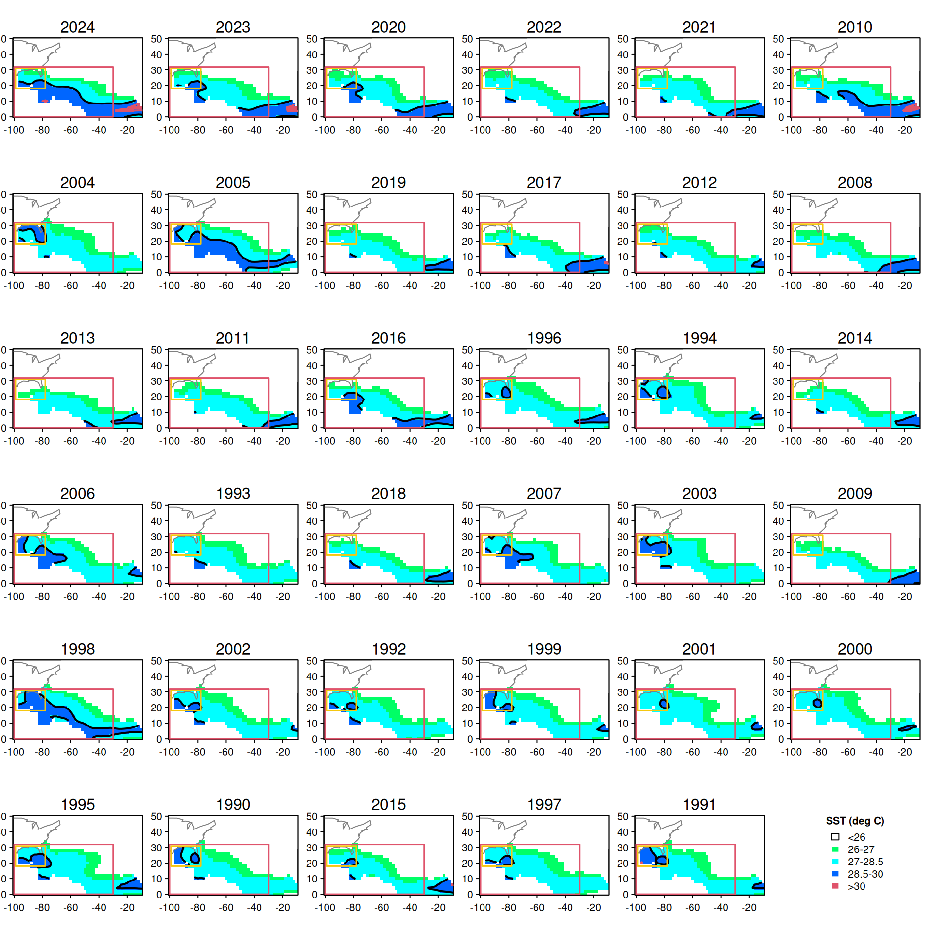 image(lon, lat, sst[, , i], add = T, col = cols, breaks = c(-2, 26, 27, 28.5, 30, 32))