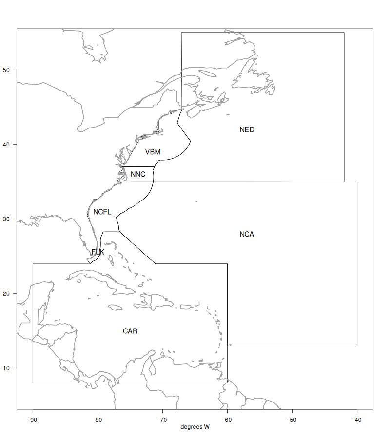 The North Central Atlantic (NCA) region, otherwise known as the Western Central Atlantic, is defined according to the boundaries of FAO area 31, but excluding the U.S. EEZ and Caribbean territorial seas to the West.