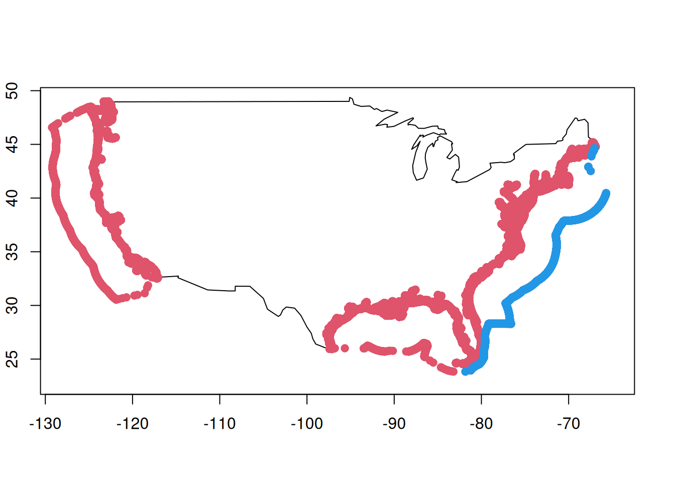 map("usa", xlim =c(-130, -63), ylim =c(22, 50))axis(1); axis(2); box()points(co$X, co$Y, pch =19, col =2)# remove points that are not in the U.S. South Atlanticco <- co[which(co$X > (-82)), ]co <- co[-which(co$X < (-81) & co$Y >25& co$Y <28), ]#plot(co$X, co$Y, col = 0)#text(co$X, co$Y, 1:nrow(co), cex = 0.7)#plot(co$X, co$Y, col = 0, xlim = c(-85, -80), ylim = c(22, 25))#text(co$X, co$Y, 1:nrow(co), cex = 0.7)# identify the northernmost and southernmost points along the Atlantic EEZco1 <- co[2100:3727, ]points(co1$X, co1$Y, col =4, pch =19)