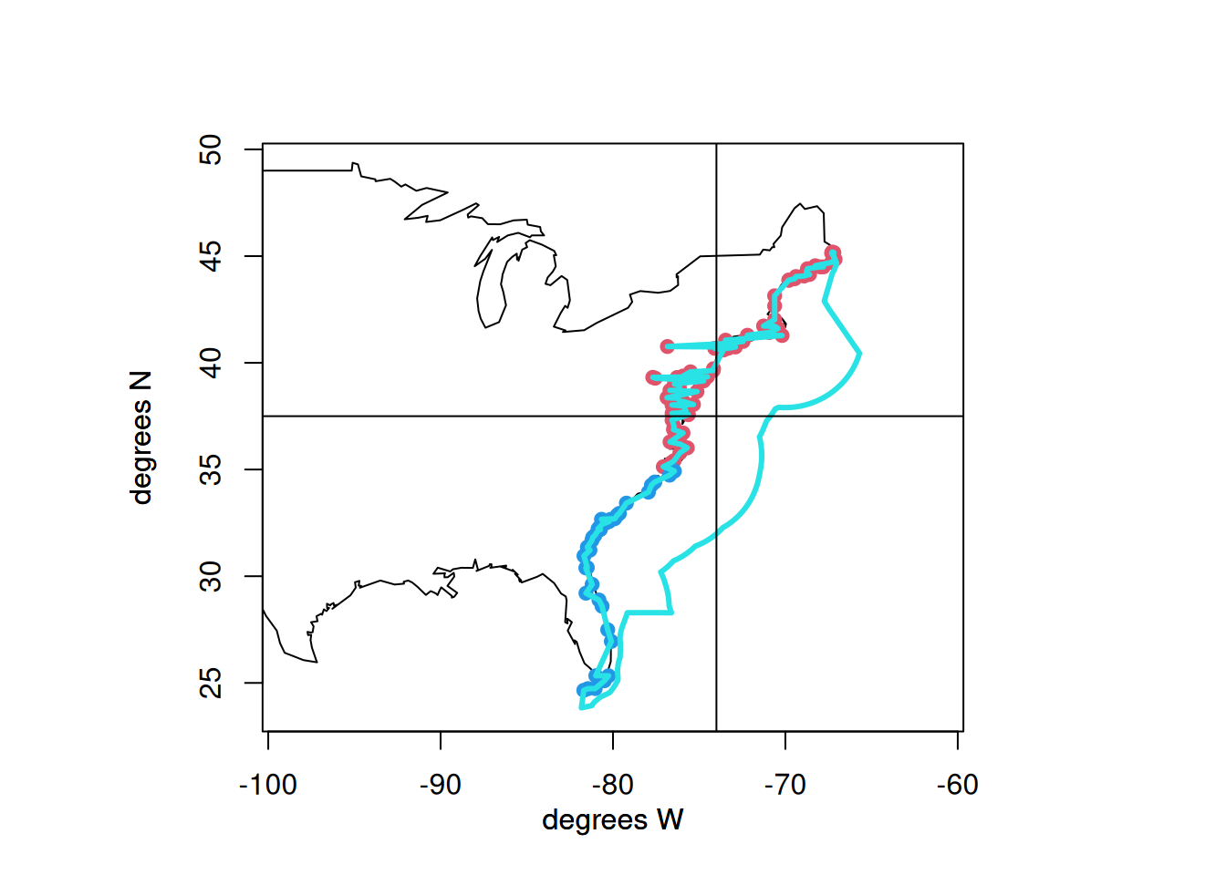 # subset points N and S of 35N for later delineationco2 <- co[-c(2100:3727), ]co3 <- co2[which(co2$Y >35), ]co4 <- co2[which(co2$Y <=35), ]# reduce number of points along the coast to make computation easierco3 <- co3[seq(1, nrow(co3), 1100), ]co4 <- co4[seq(1, nrow(co4), 800), ]map("usa", xlim =c(-100, -60), ylim =c(23, 50))mtext(side =1, "degrees W", line =2); mtext(side =2, "degrees N", line =3)mtext(side =1, "degrees W", line =2); mtext(side =2, "degrees N", line =3)axis(1); axis(2); box()points(co3$X, co3$Y, col =2, pch =19)points(co4$X, co4$Y, col =4, pch =19)co2 <-rbind(co3, co4)co2 <- co2[order(co2$Y), ]cofin <-rbind(co1, co2)polygon(cofin$X, cofin$Y, border =5, lwd =3)# make the polygon along the coast line a bit more linearabline(h =37.5)abline(v =-74)
