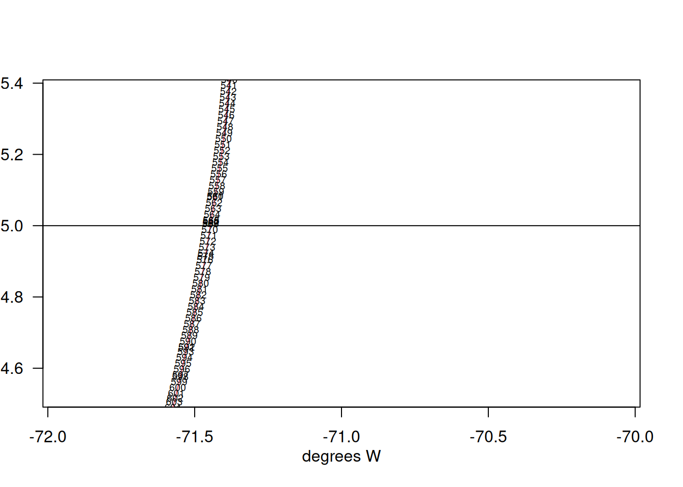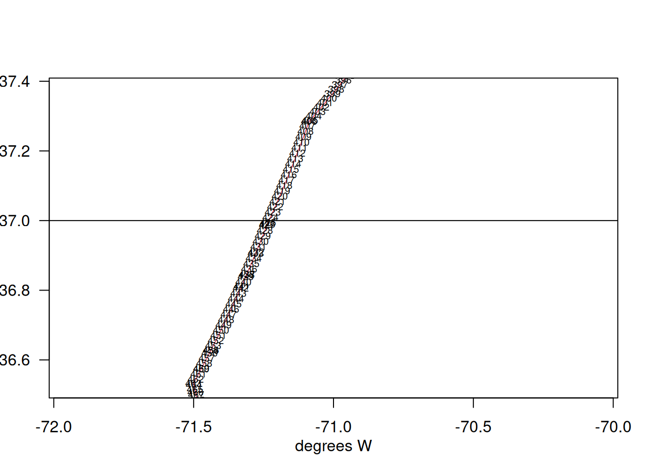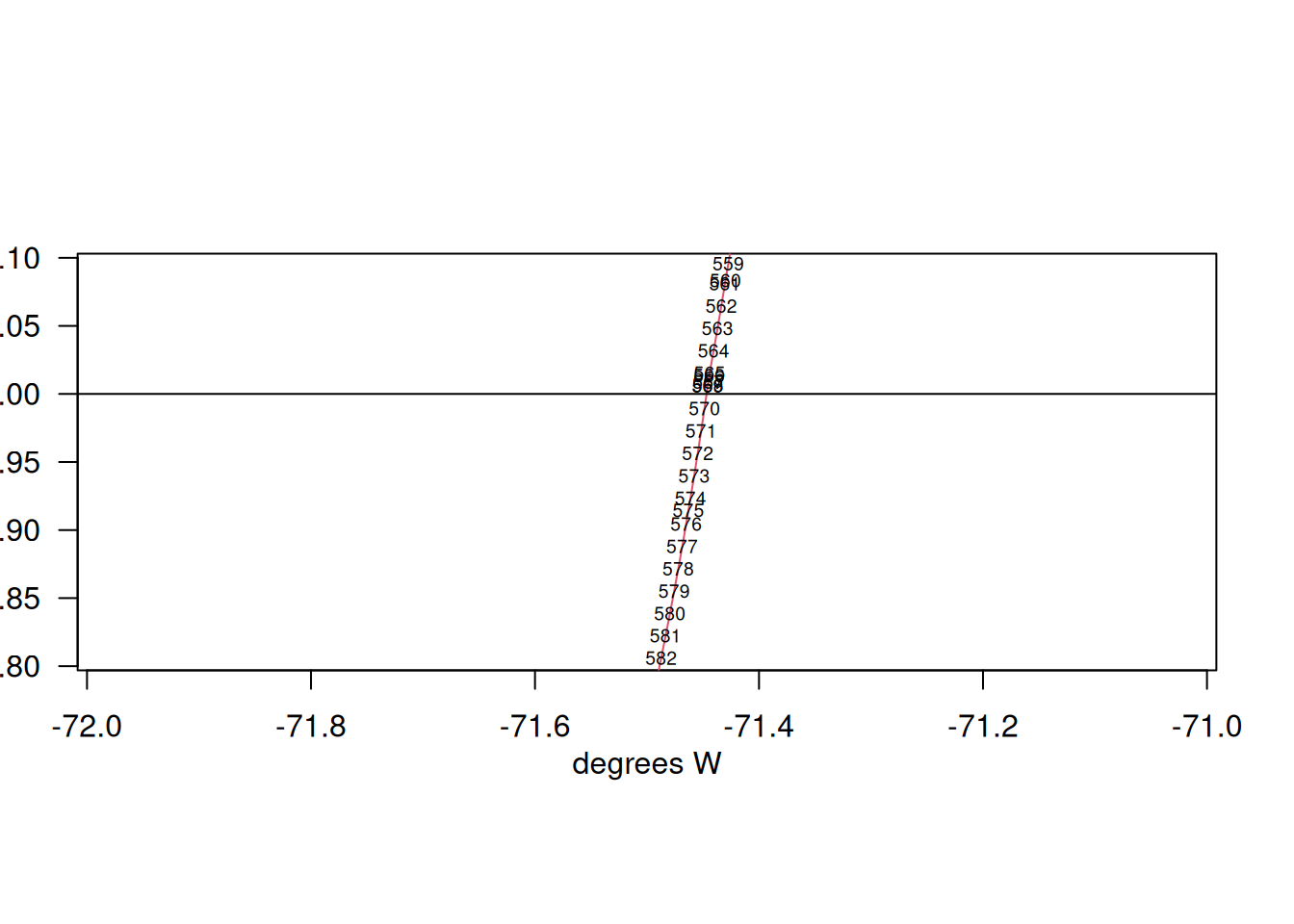 map(database ="usa", xlim =c(-72, -70), ylim =c(34.5, 35.4))mtext(side =1, "degrees W", line =2); mtext(side =2, "degrees N", line =3)axis(1); axis(2, las =2); box()polygon(cofin$X, cofin$Y, border =2)text(cofin$X, cofin$Y, 1:nrow(cofin), cex =0.6) # find points that fall at 35Nabline(h =35)