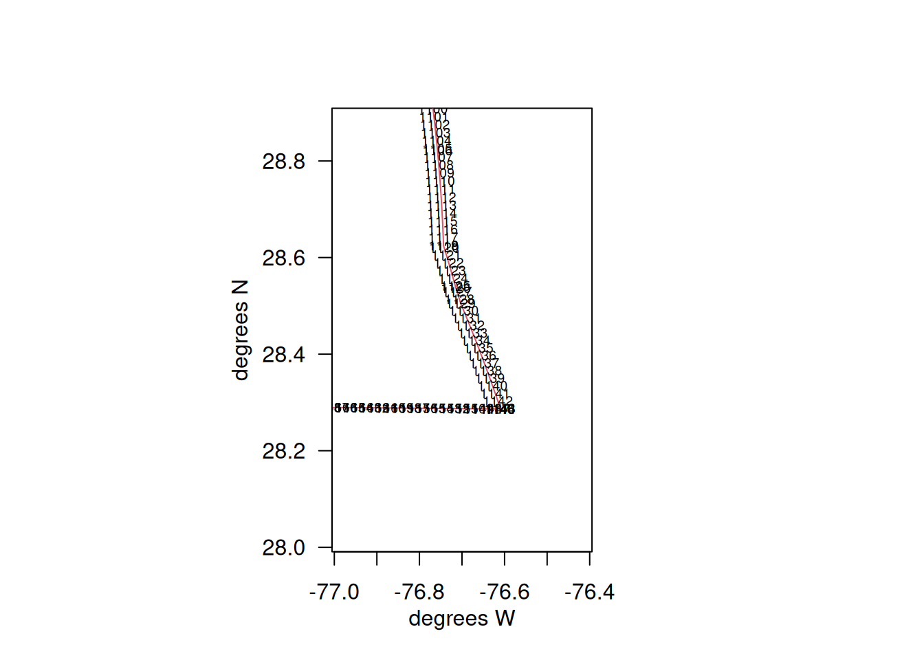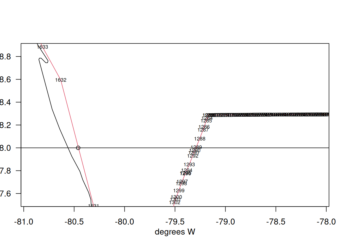 map(database ="usa", xlim =c(-77, -76.4), ylim =c(28, 28.9))mtext(side =1, "degrees W", line =2); mtext(side =2, "degrees N", line =3)axis(1); axis(2, las =2); box()polygon(cofin$X, cofin$Y, border =2)text(cofin$X, cofin$Y, 1:nrow(cofin), cex =0.6)
