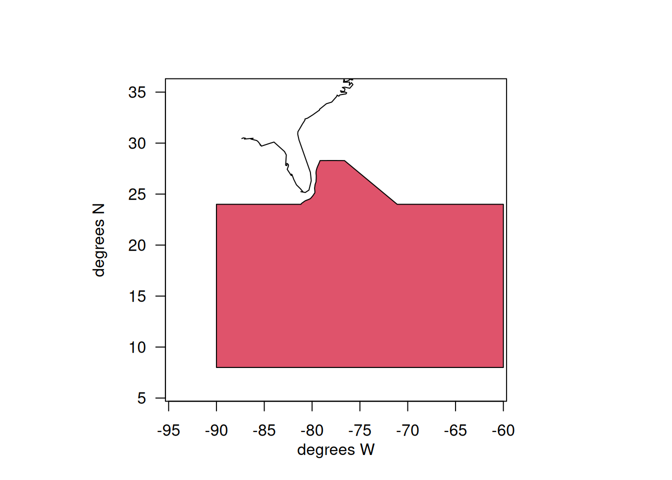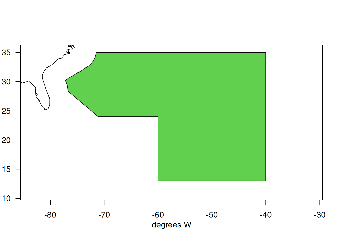nca1 <- cofin[569:1143, ] # subset points along EEZnca2 <-data.frame(cbind(c(-71.1, -60, -60, -40, -40), c(24, 24, 13, 13, 35))) # define boundaries according to FAOnames(nca2) <-c("X", "Y")NCA <-rbind(nca1, nca2)names(NCA) <-c("X", "Y")map(database ="usa", xlim =c(-85, -30), ylim =c(10, 36)) mtext(side =1, "degrees W", line =2); mtext(side =2, "degrees N", line =3)axis(1); axis(2, las =2); box()polygon(NCA$X, NCA$Y, col =3)
