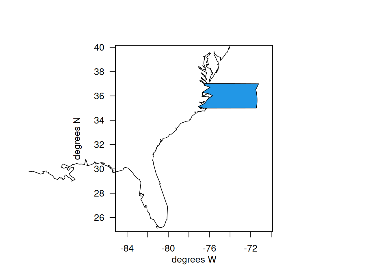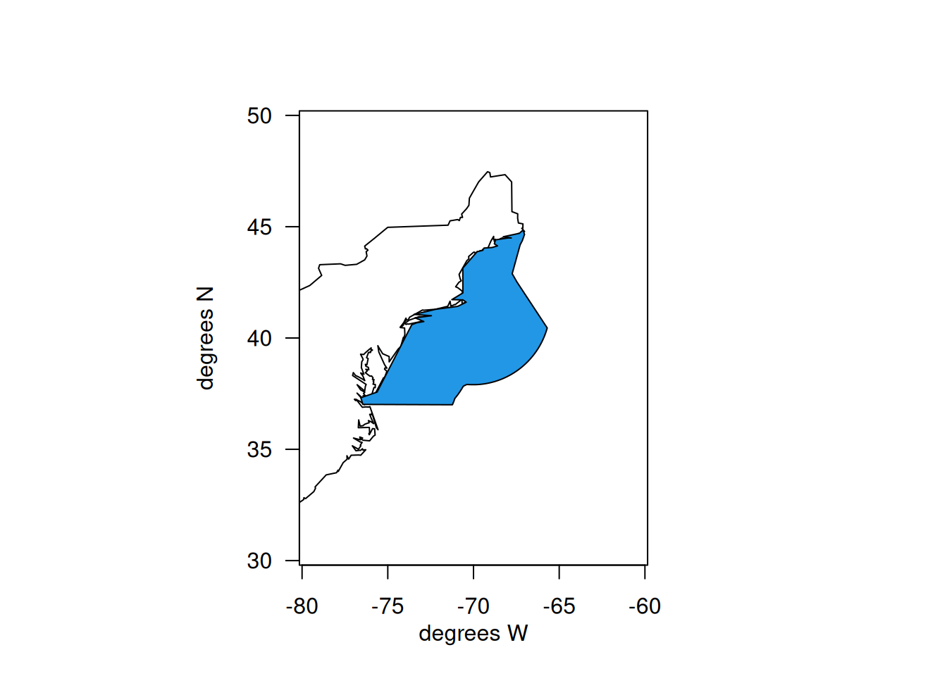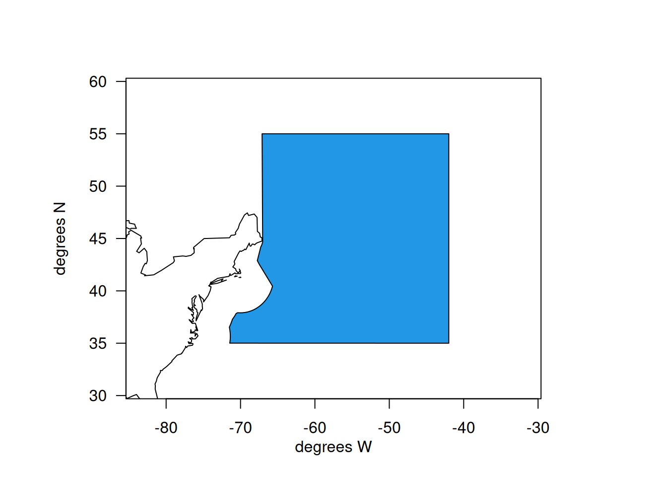 ned1 <- cofin[1:569, ] # subset points along EEZned2 <-data.frame(cbind(c(-42, -42, -67.1), c(35, 55, 55))) # define boundaries according to FAOnames(ned2) <-c("X", "Y")NED <-rbind(ned1, ned2)names(NED) <-c("X", "Y")map(database ="usa", xlim =c(-85, -30), ylim =c(30, 60)) mtext(side =1, "degrees W", line =2); mtext(side =2, "degrees N", line =3)axis(1); axis(2, las =2); box()polygon(NED$X, NED$Y, col =4)