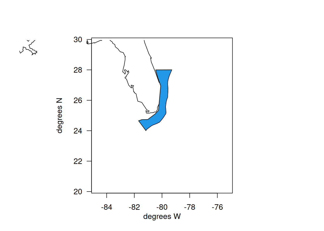 FLK <- cofin[1289:1632, ] # subset points along EEZmap(database ="usa", xlim =c(-85, -75), ylim =c(20, 30)) mtext(side =1, "degrees W", line =2); mtext(side =2, "degrees N", line =3)axis(1); axis(2, las =2); box()polygon(FLK$X, FLK$Y, col =4)